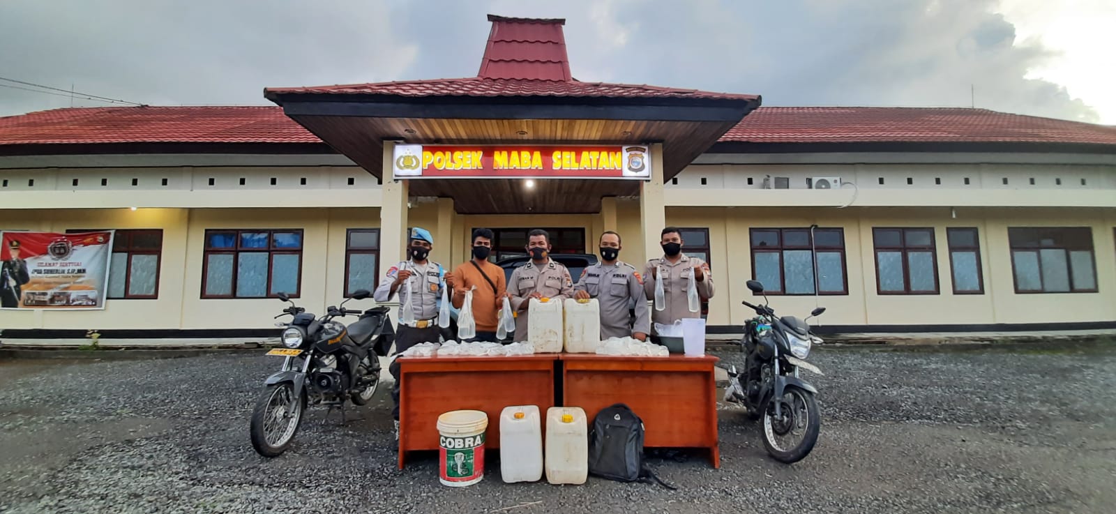 “Total minuman yang di sita adalah 50 kantong plastik dan 2 galon yang berukuran 25 liter. Barang bukti tersebut sudah diamankan di Mapolsek Maba Selatan,”katanya.
