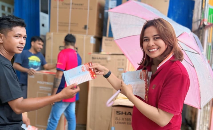 Mereka membagikan flyer berisi informasi promo sekaligus berdialog langsung dengan pelanggan untuk mendorong pemanfaatan kesempatan langka ini.