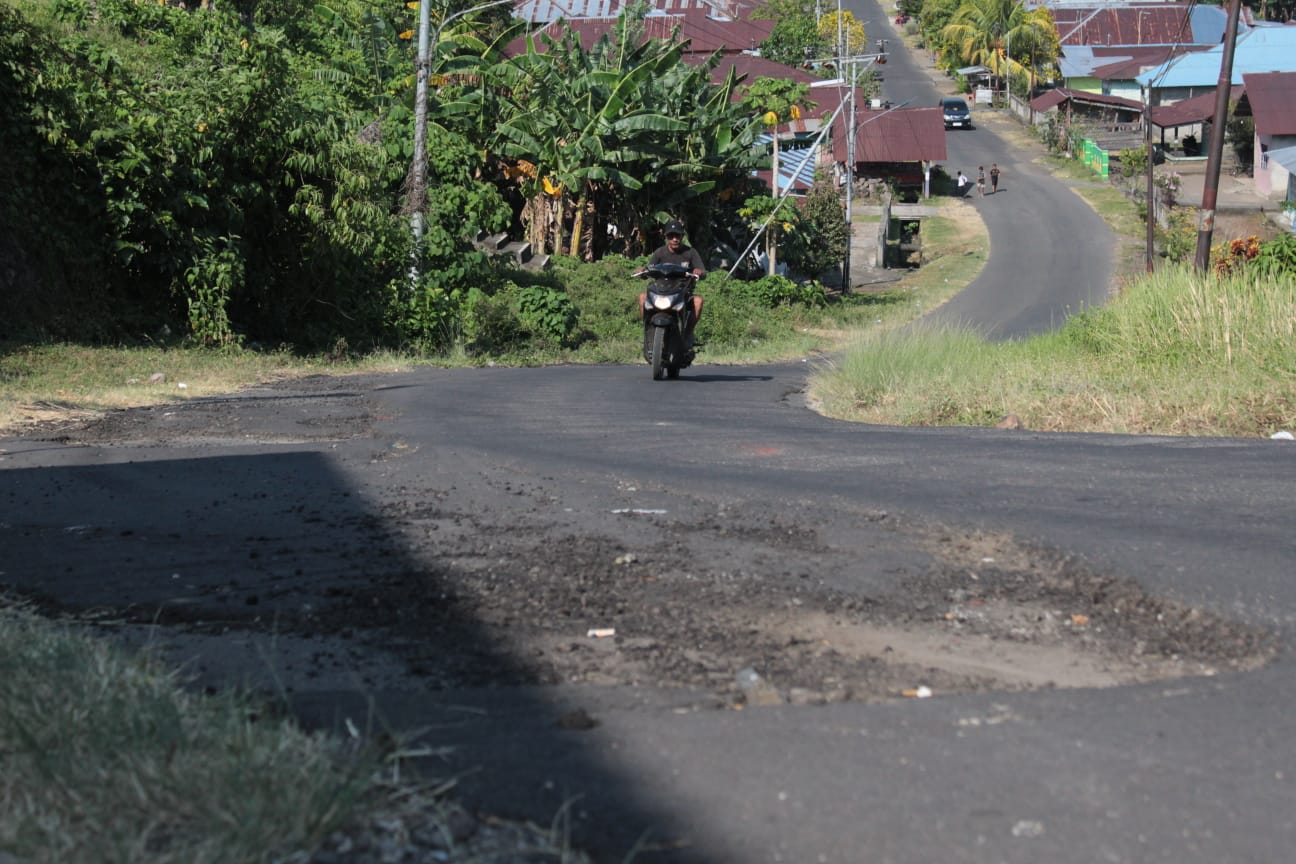 Kondisi jalan rusak parah itu tepatnya di depan Rumah Tahfidz Daarul Qur’an, Desa Bobanehena. Jalan berlubang itu tidak hanya mengganggu kenyamanan berkendara, namun juga berpotensi menyebabkan kecelakaan, terutama bagi pengendara sepeda motor.
