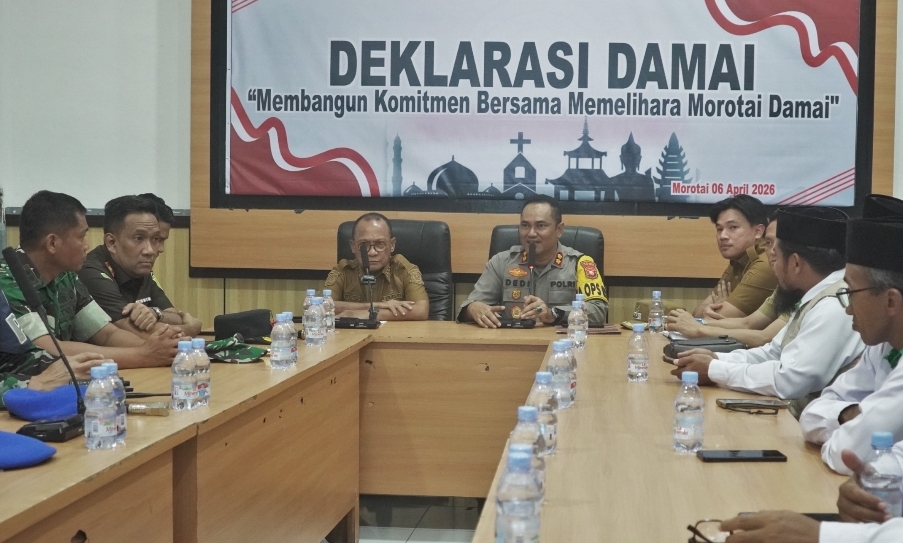 Beritadetik.id – Pemerintah Kabupaten (Pemkab) Pulau Morotai bersama unsur Forkopimda, tokoh agama, dan tokoh masyarakat menggelar rapat koordinasi sekaligus Deklarasi Damai “Membangun Komitmen Bersama Memelihara Morotai Damai“. Kegiatan strategis ini berlangsung di Aula Polres Pulau Morotai, Desa Daruba, Kecamatan Morotai Selatan, pada Senin (06/04/2026).